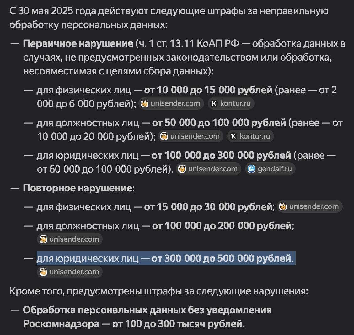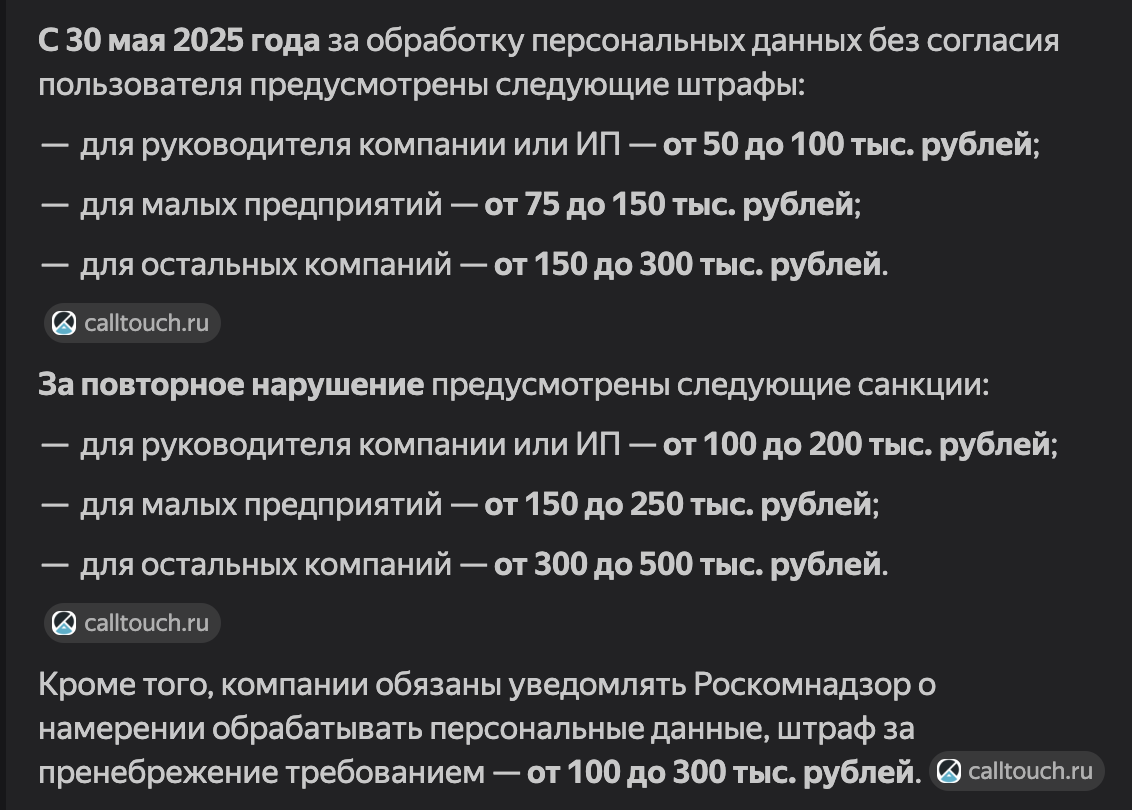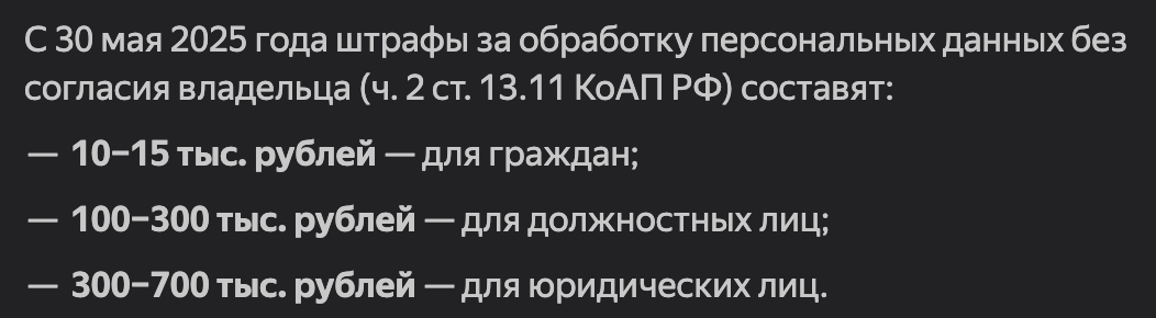 За обработку персональных данных клиентов без согласия пользователей - от 50 до 300 тысяч рублей!
