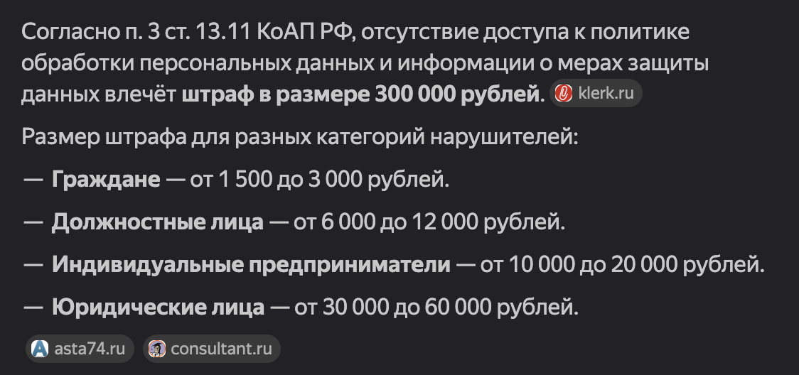 Отсутствие согласия клиента о том, что вы обрабатываете его персональные данные (ПД) - до 300 - 700 тысяч рублей!